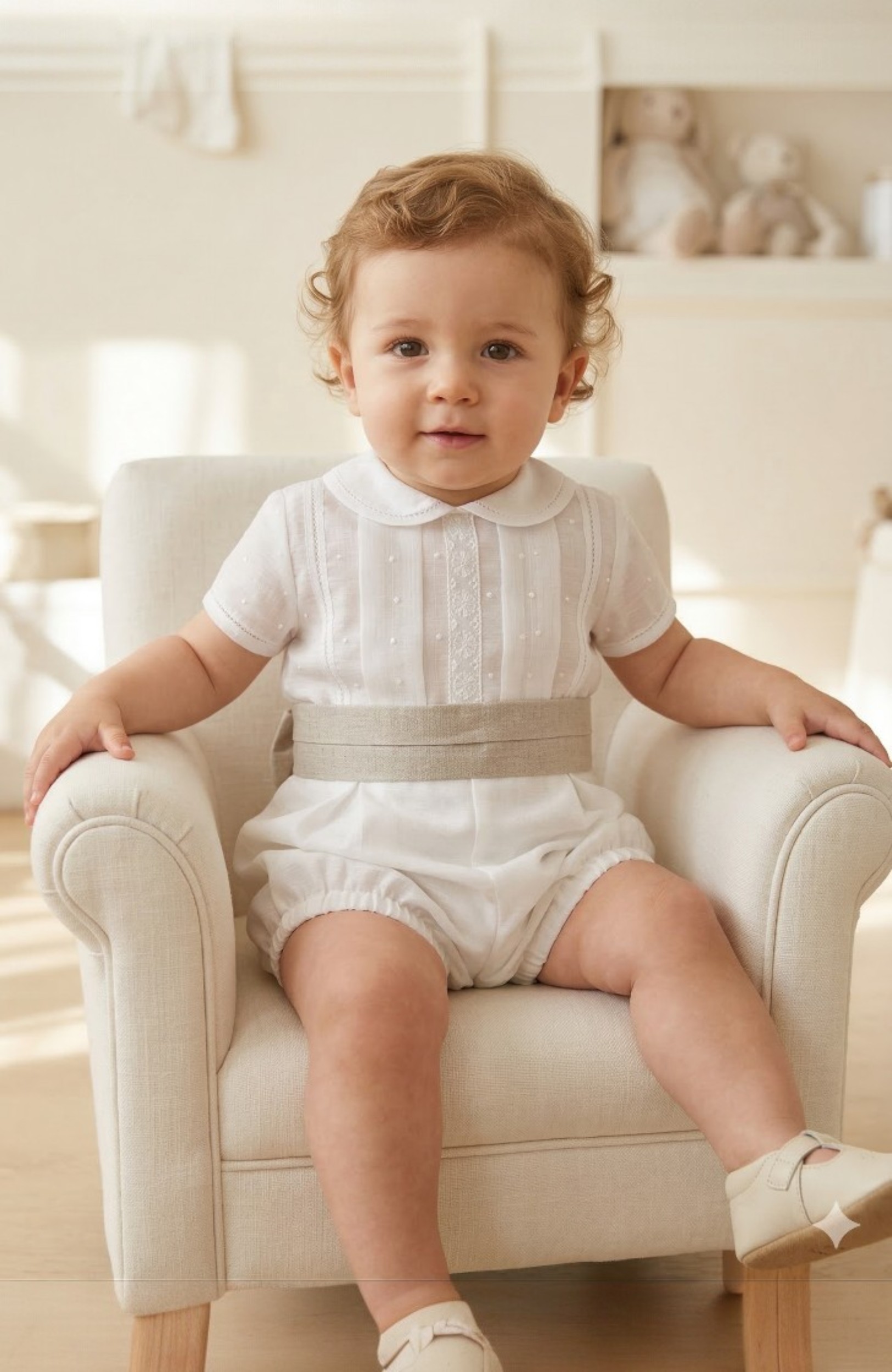 Traje de Bautizo para niño bebé en batista inglesa con fajín tostado. Un look lleno de ternura para un momento irrepetible