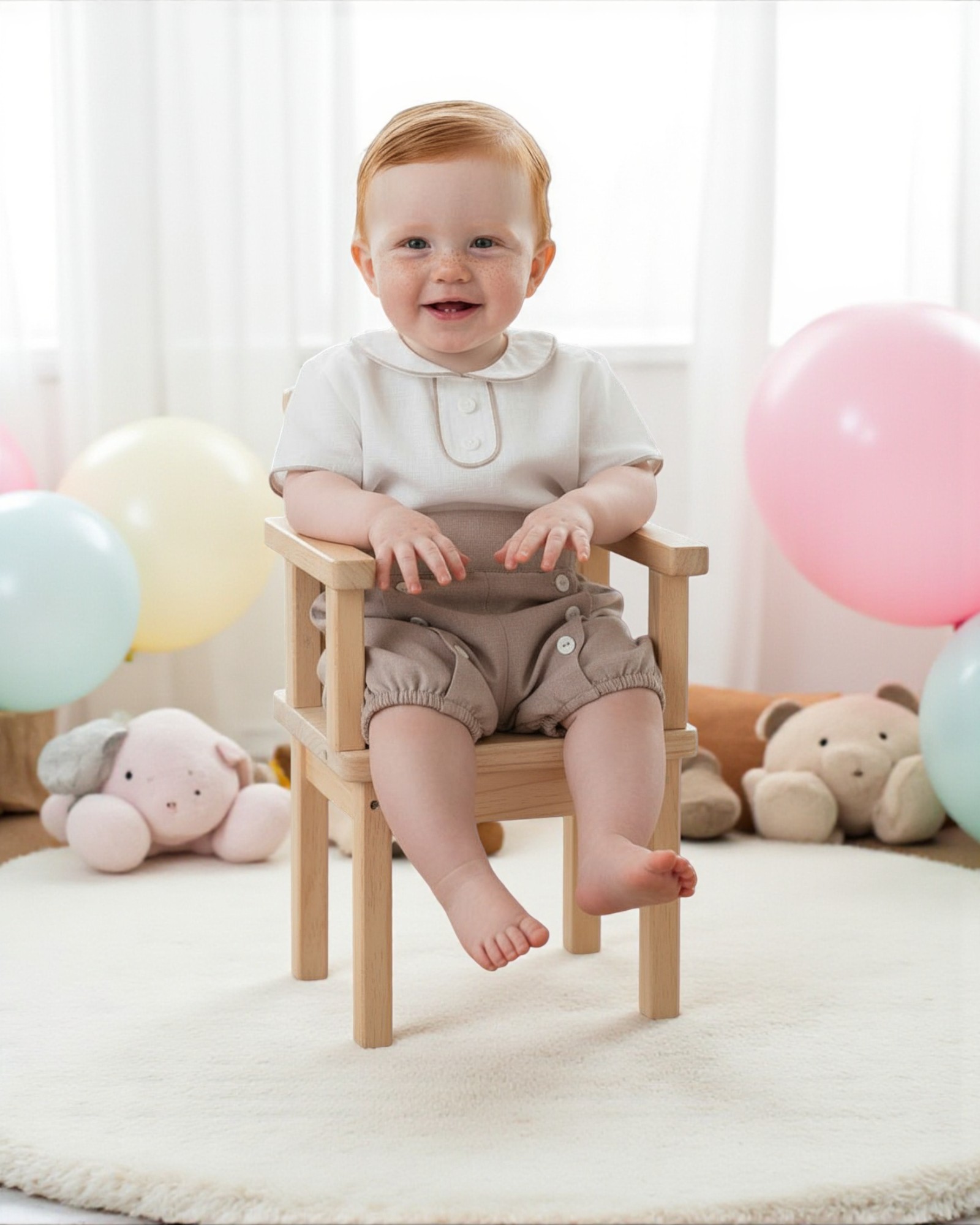 La camisa presenta cuello bebé con vivo a contraste, cierre trasero con botones nacarados y pechera adornada en armonía con el pantalón. El bombacho, además de forrado, incorpora ojales que permiten unirlo a la camisa, manteniendo el conjunto siempre colocado y favorecedor. La cintura elástica y el tejido ligero garantizan que el bebé esté cómodo desde el primer abrazo hasta la última foto del día.