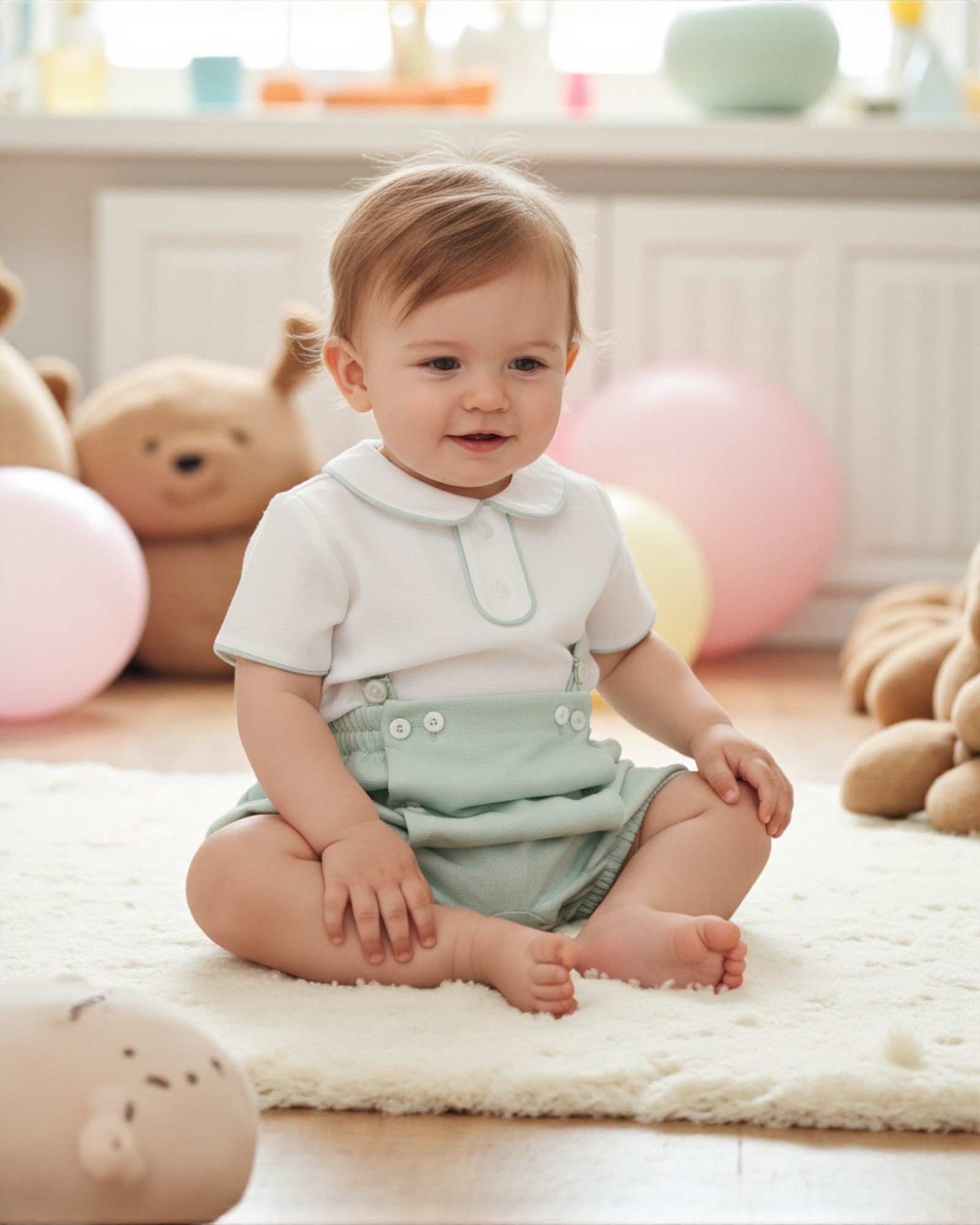 La camisa, con cuello bebé y botonadura trasera, presenta un vivo a contraste en mangas y pechera que armoniza a la perfección con el pantalón. Este, además de estar forrado, cuenta con ojales que permiten unir ambas piezas con botones, manteniendo el conjunto siempre impecable. La cintura elástica del bombacho se adapta sin apretar y da libertad de movimiento al bebé.