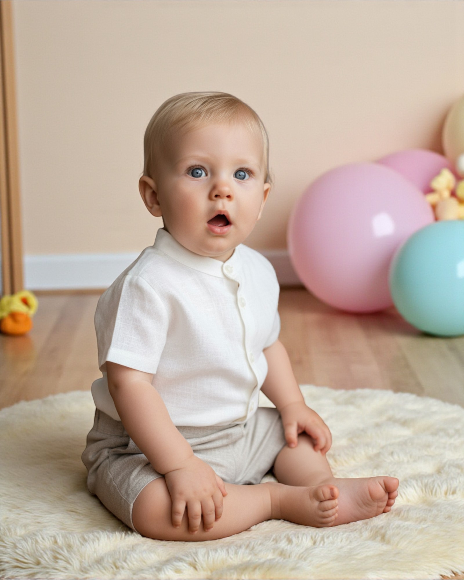 Hay momentos que se graban en el corazón, y este conjunto de ceremonia infantil está pensado precisamente para vestirlos con estilo, ternura y máxima comodidad. Confeccionado en lino natural, este outfit para bebé niño —disponible desde 3 hasta 2 años— combina una camisa cruda de manga corta con cuello mao y botones nacarados, y un pantalón corto forrado en tono tostado que aporta calidez y distinción.