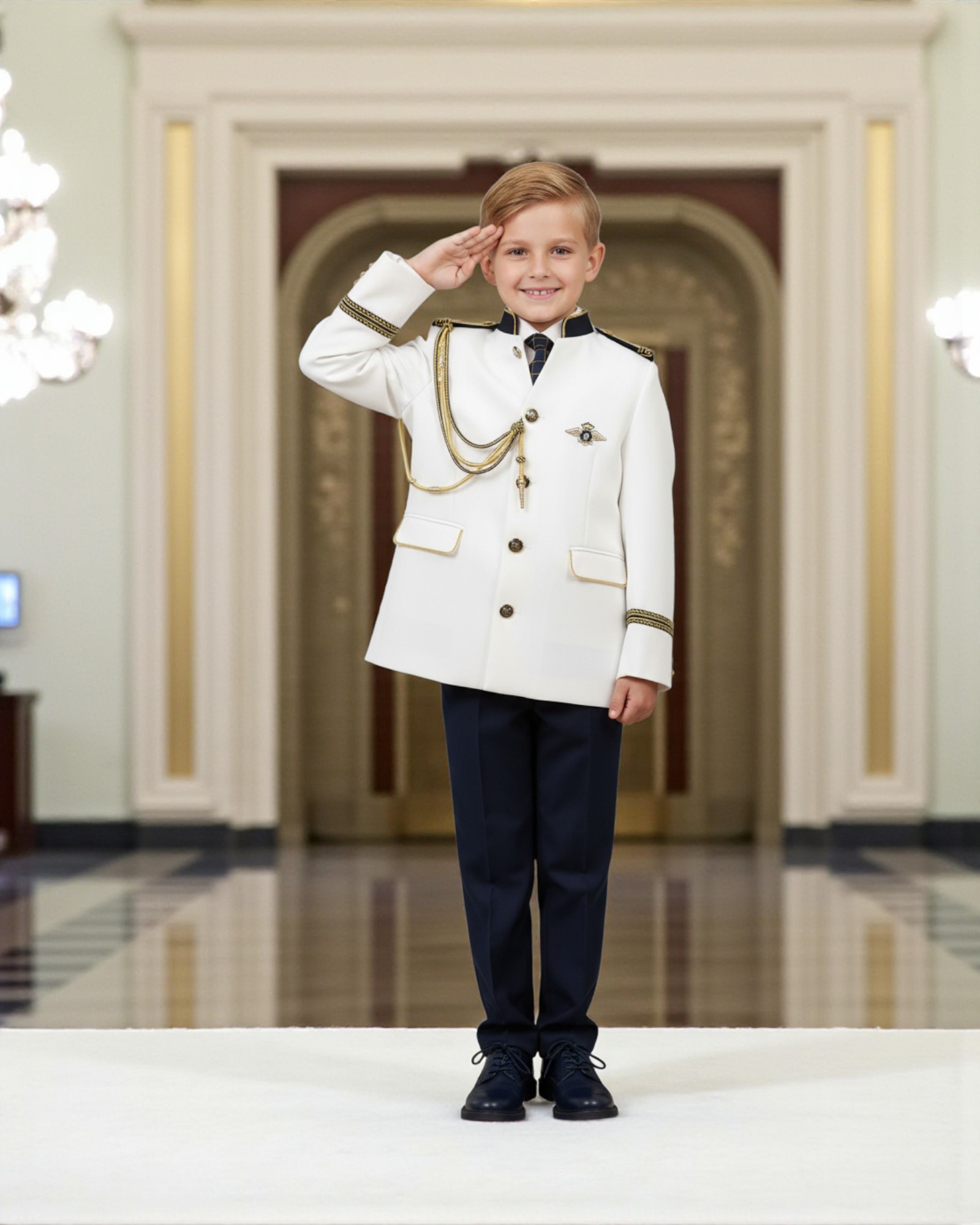 La chaqueta en tono crudo, adornada con galones y cordón dorados, combina a la perfección con el pantalón azul marino, mientras que el chaleco y la corbata dorados aportan un toque luminoso y majestuoso. El conjunto transmite serenidad, orgullo y un porte impecable, manteniendo la esencia del almirante clásico que nunca pasa de moda.