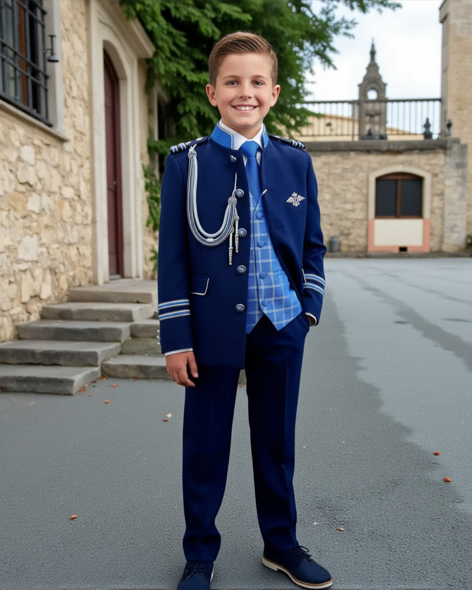 El conjunto está formado por americana de botonadura clásica con galones bordados en las mangas, pantalón a juego, chaleco celeste con cuadros y corbata lisa coordinada. La chaqueta, en azul marino intenso, incluye detalles celestes en los vivos y botones metálicos personalizados. El escudo bordado en el pecho y el cordón con pasamanería en plata y azul aportan un aire ceremonial lleno de estilo.
