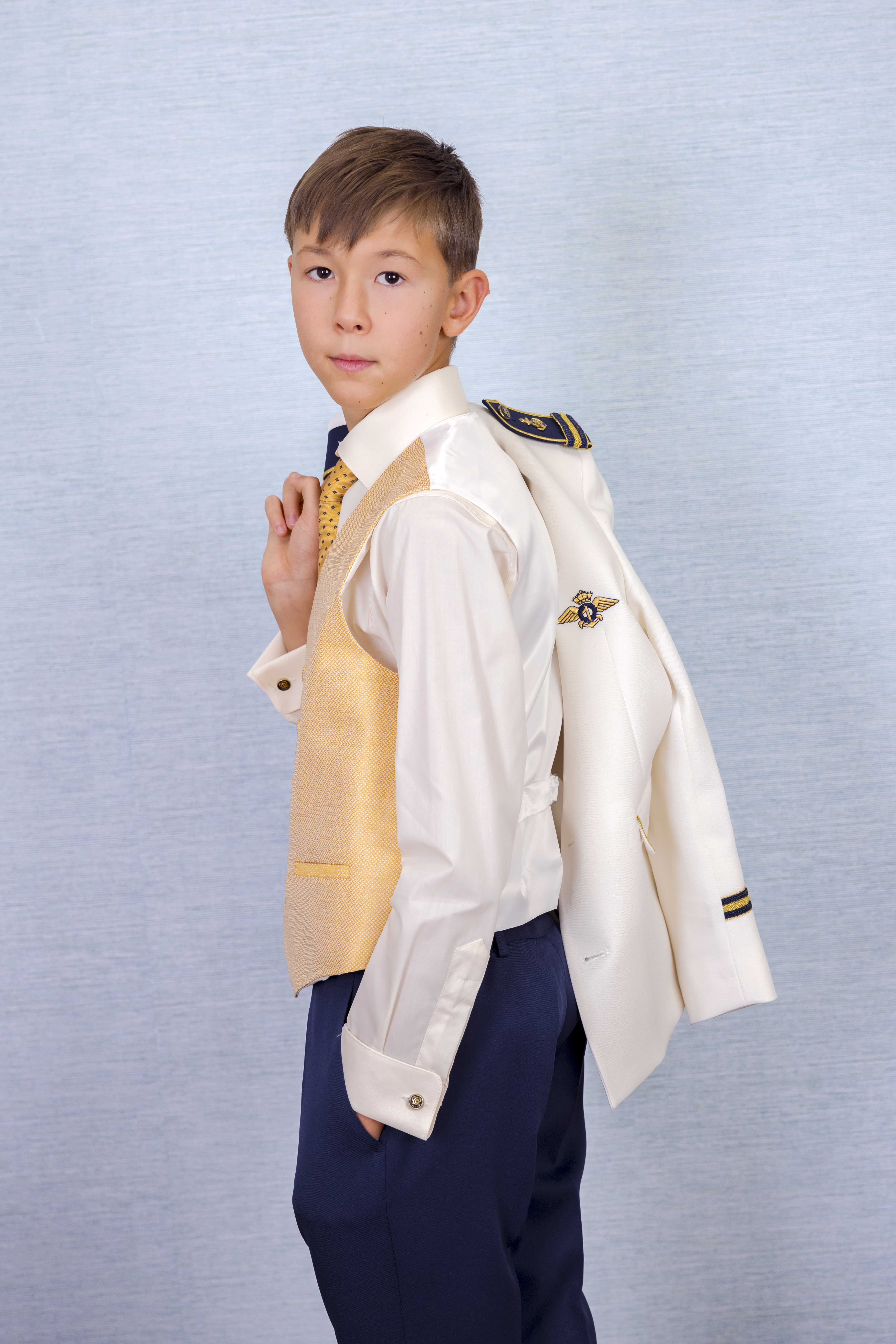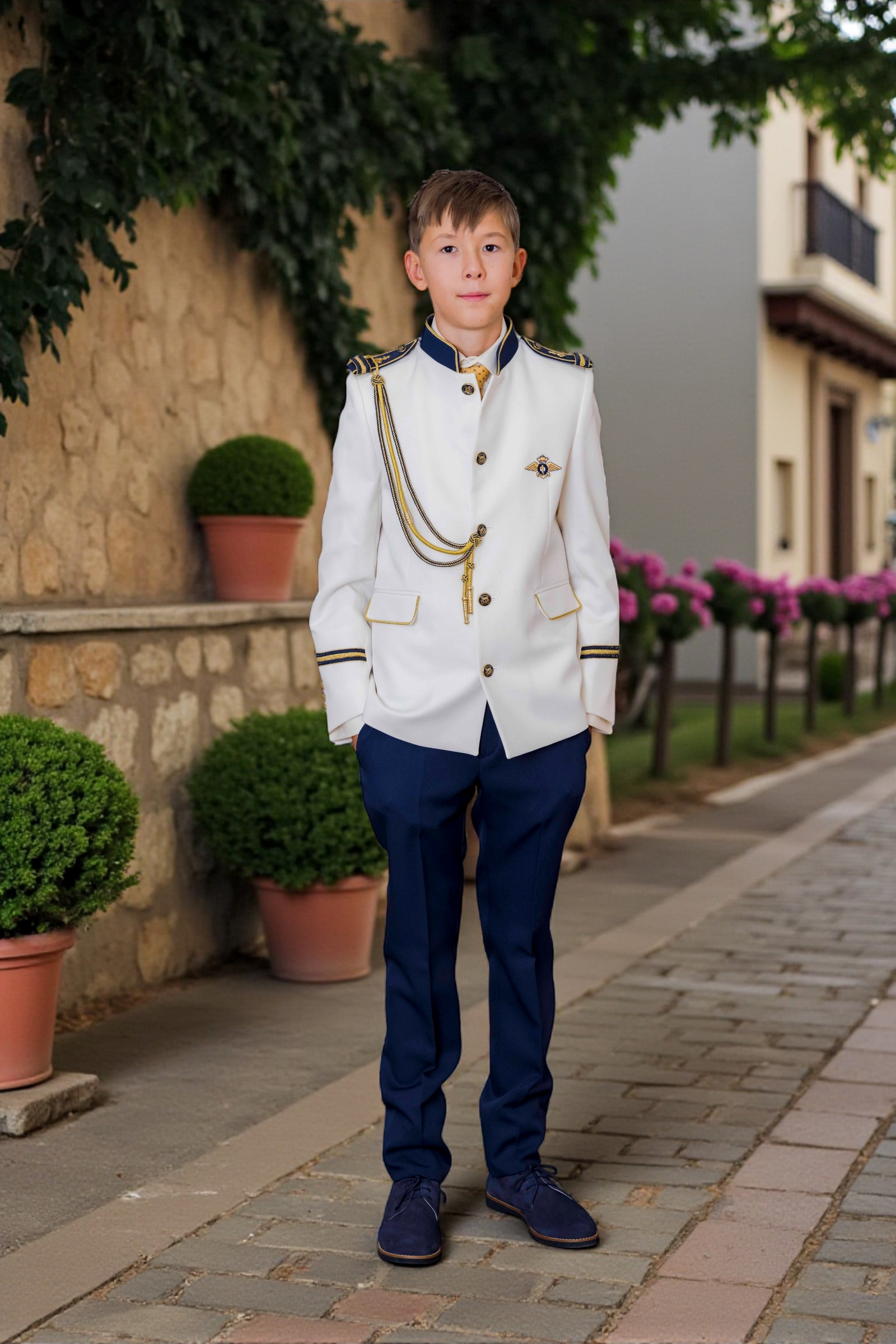 El diseño destaca por su impecable chaqueta cruda con cuello y hombreras marino, ribetes dorados y botonadura a juego. El chaleco y la corbata, en tono mostaza con textura, aportan calidez y un estilo único. El pantalón marino contrasta con sobriedad y equilibrio, completando un conjunto perfecto para una celebración religiosa o familiar con estilo y tradición.