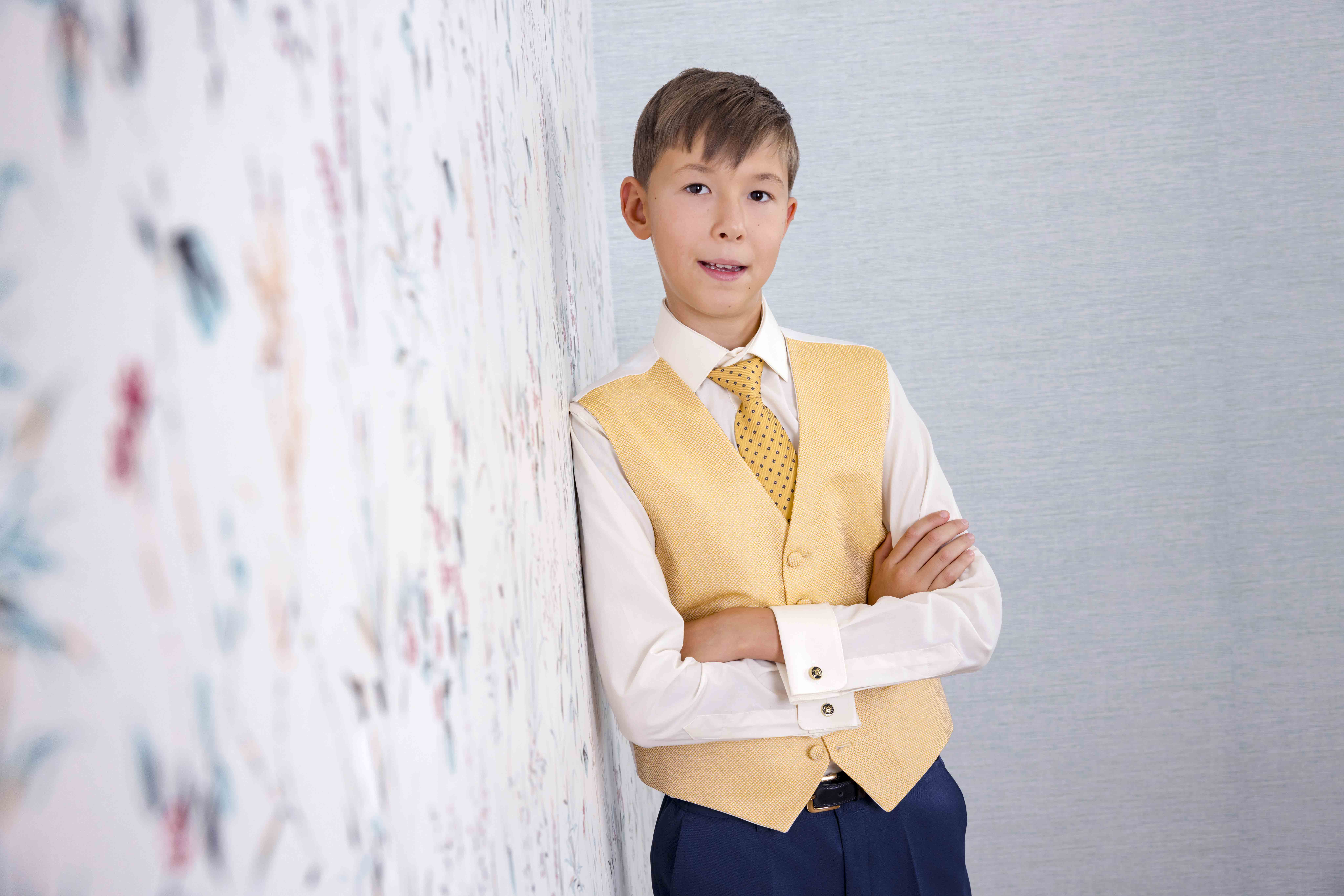 Hay días que marcan para siempre. Este traje de Comunión tipo almirante, con americana cruda y detalles en azul marino y mostaza, es mucho más que un conjunto elegante: es el símbolo de ese gran paso que da tu hijo con orgullo y emoción.