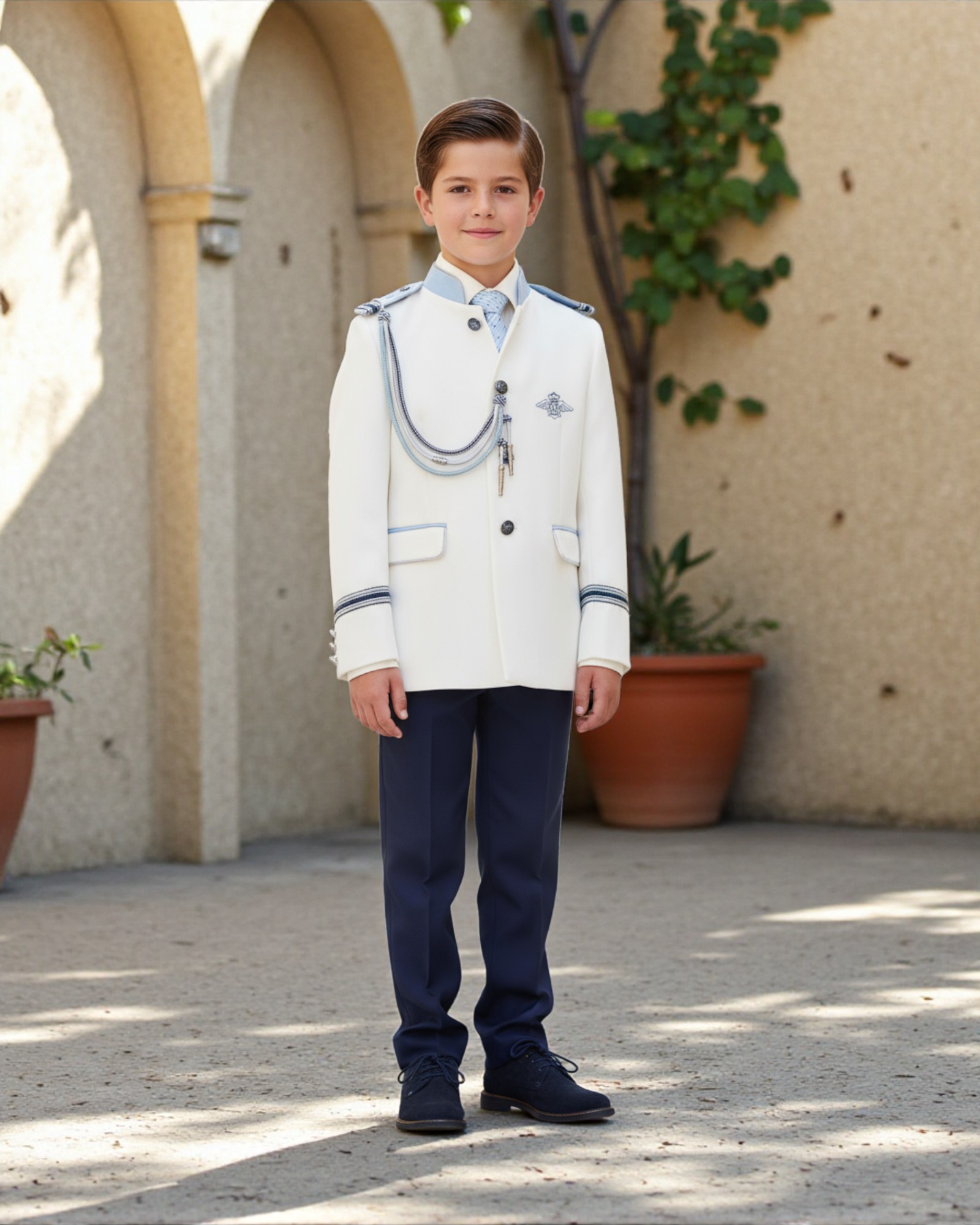 Este traje de Almirante de Comunión de 5 piezas combina la sofisticación tradicional con la elegancia moderna que distingue a los pequeños protagonistas de Vuvalu.