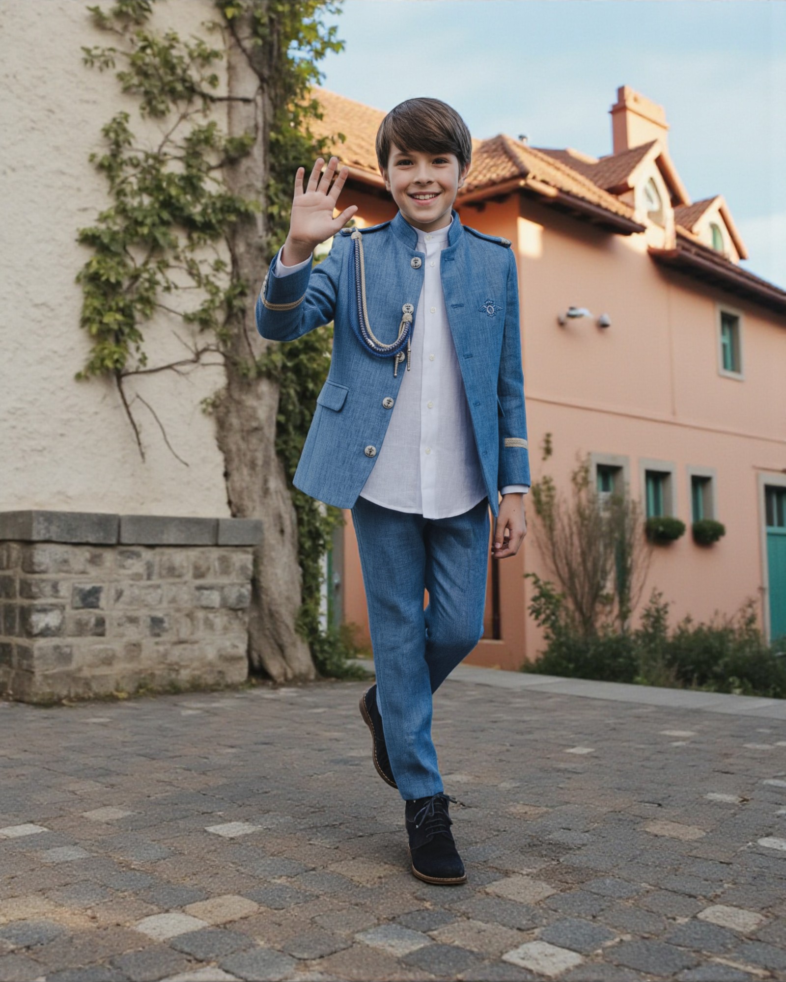 Un momento tan importante como la Comunión merece un look inolvidable. Este traje estilo almirante, confeccionado íntegramente en lino azul denim, es perfecto para los niños que quieren sentirse protagonistas sin renunciar a la comodidad. Ligero, elegante y con carácter, transmite la solemnidad del momento con un toque actual.