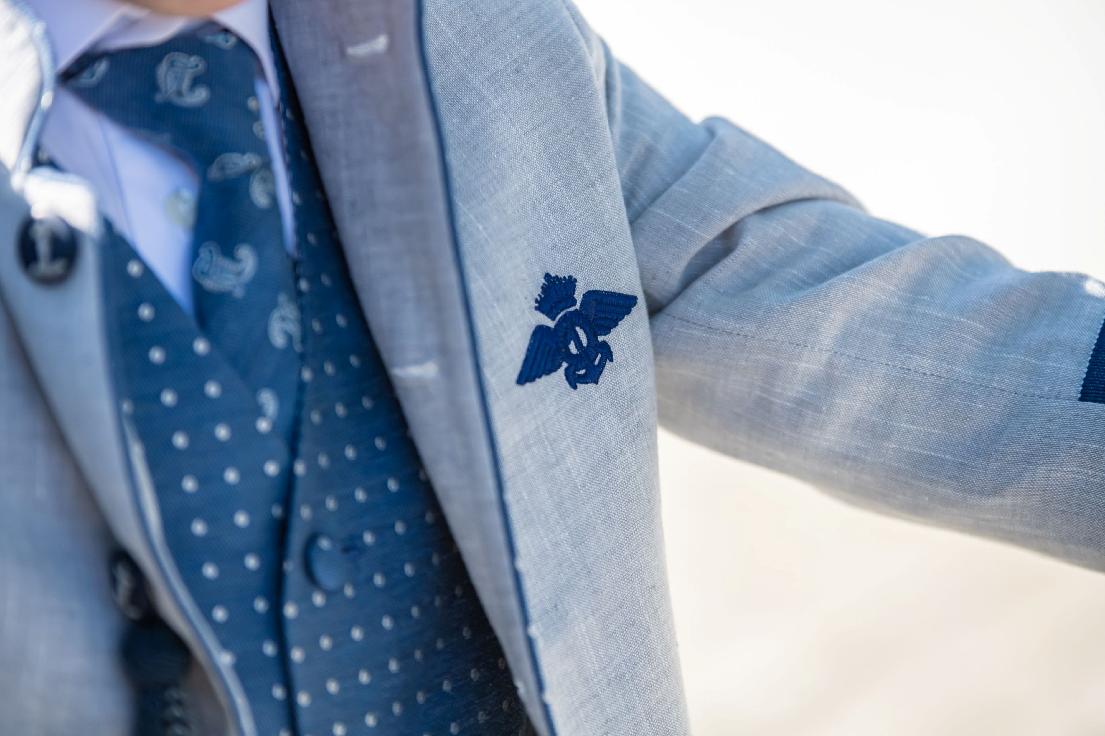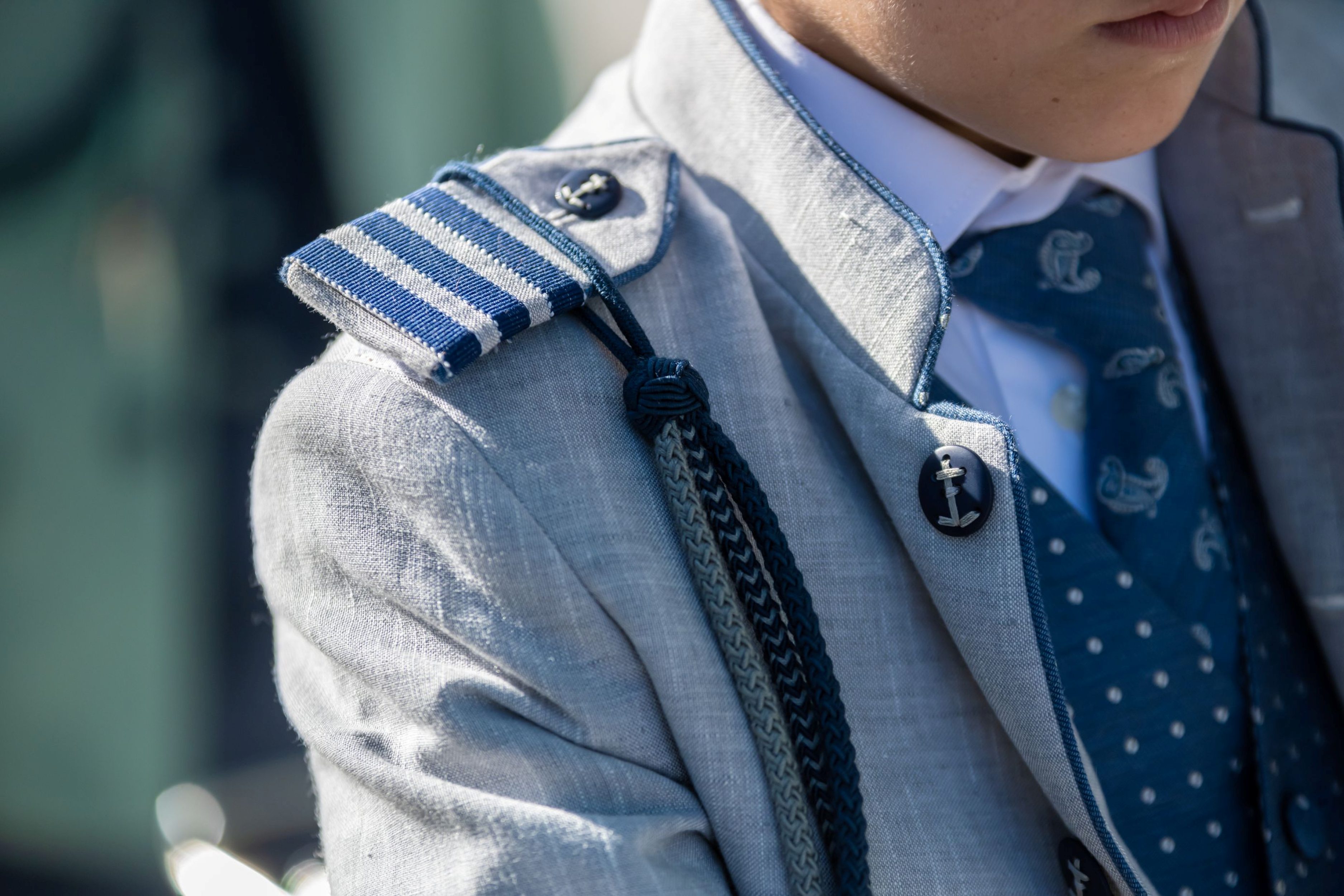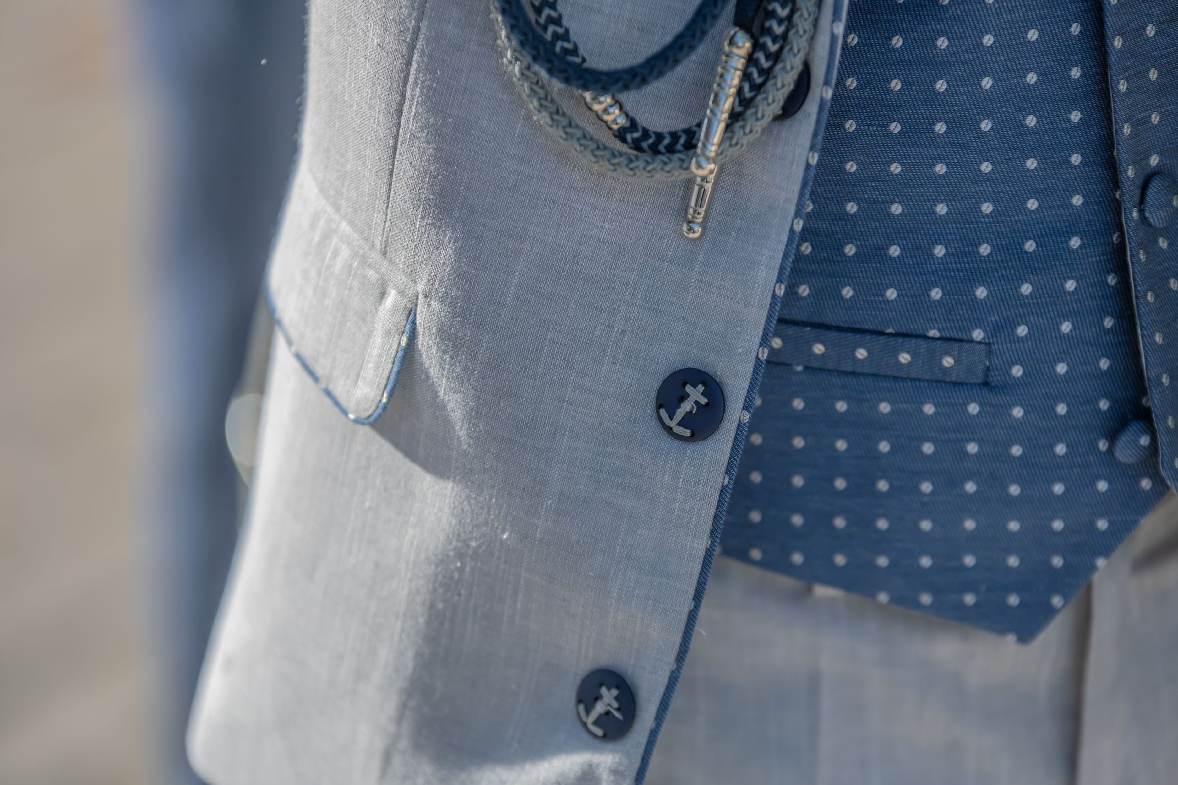 Este traje tipo almirante de la firma Varones está confeccionado en un delicado lino gris claro con detalles azul marino, que aportan contraste, estilo y serenidad. La chaqueta de cuello mao y corte semientallado realza la figura sin perder comodidad. El galón bordado en las mangas, el emblema en el pecho y la botonadura metálica en plata envejecida completan un diseño impecable.