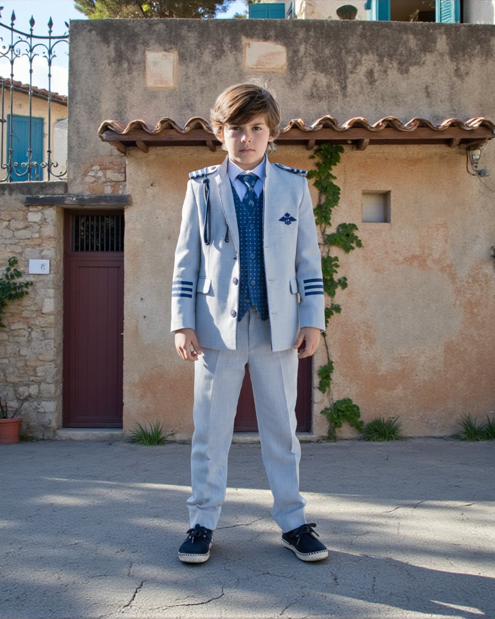 Ideal para celebraciones al aire libre, primavera-verano y Comuniones con luz y frescura. Puedes completarlo con nuestros zapatos de lino gris a juego o de ante en color azul, disponibles en la sección de calzado.