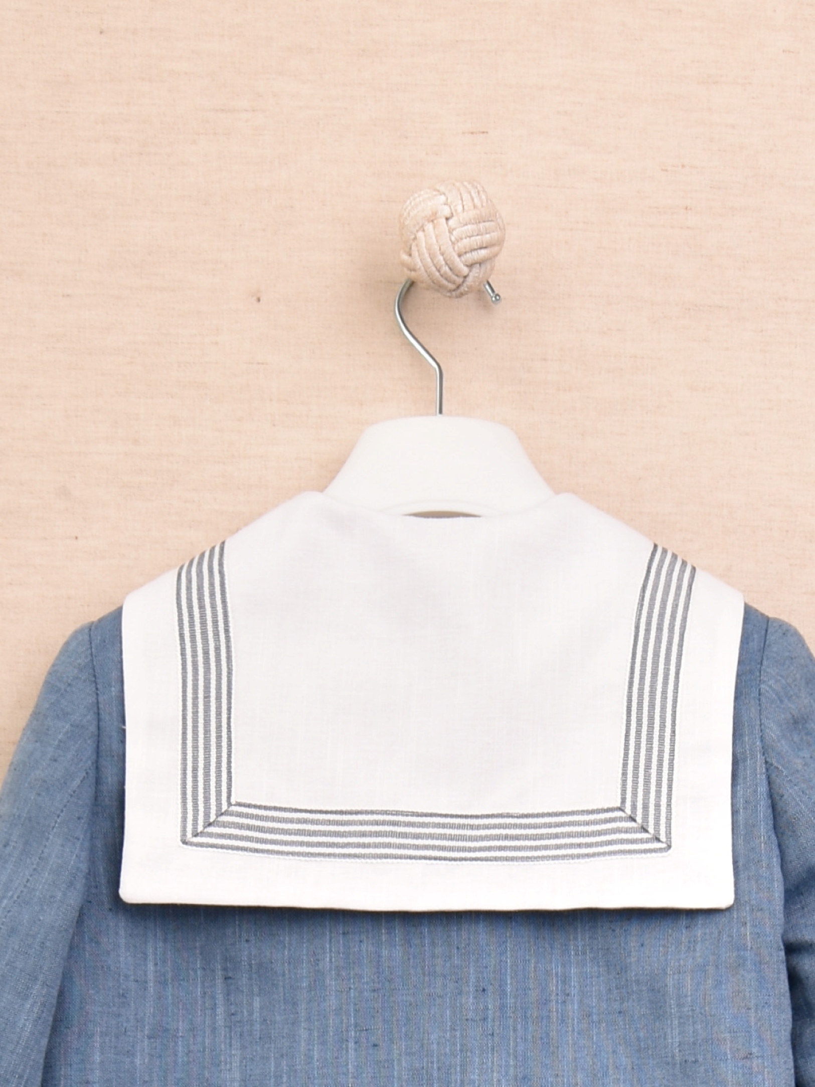 Confeccionado en dos piezas —casaca con cuello marinero y pantalón largo blanco—, destaca por la textura natural del lino, su color azul tipo tejano y los ribetes blancos con finas líneas gris perla en cuello, mangas y lazada. El ancla bordada en la manga añade un toque simbólico y elegante.