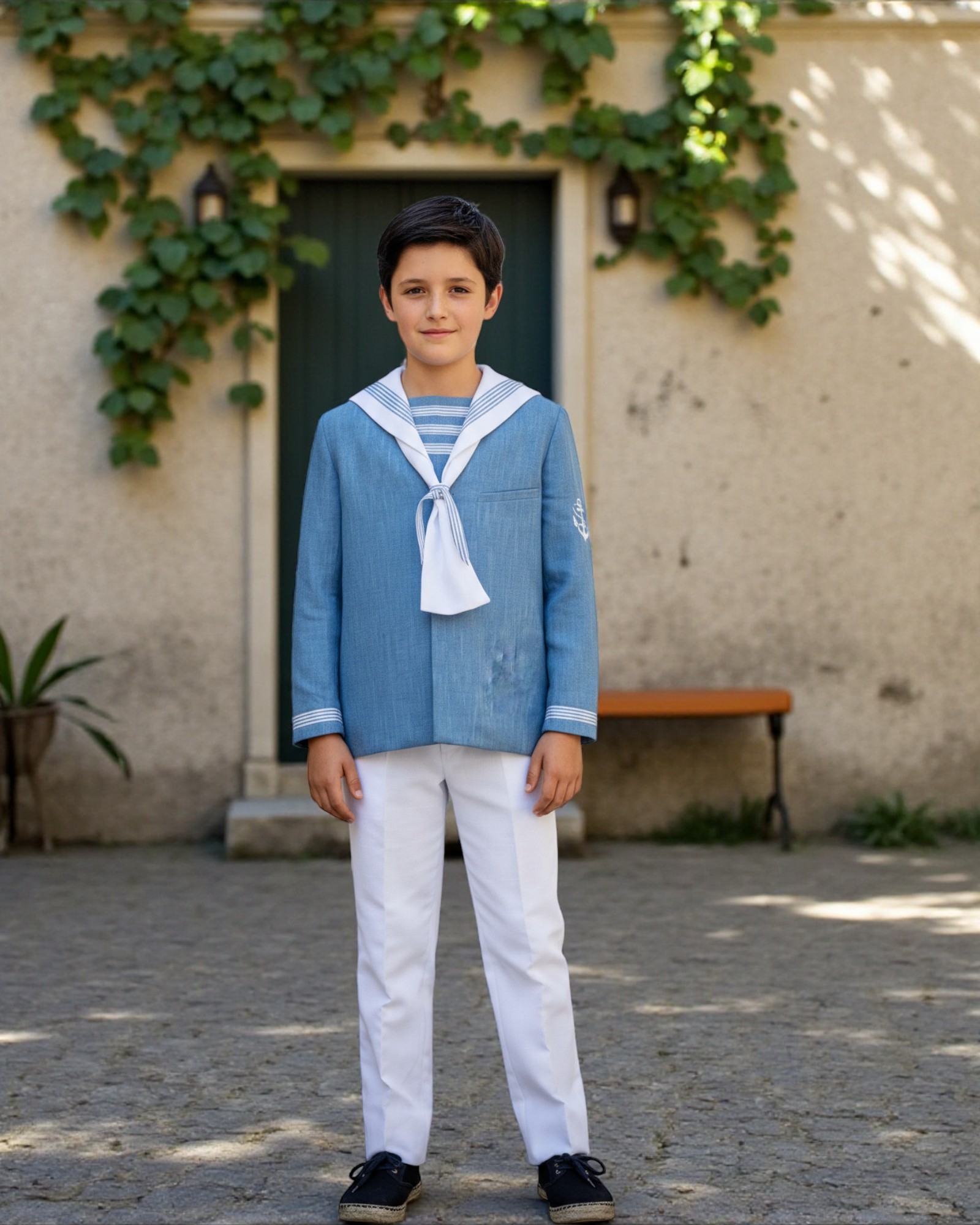 Un día especial merece un look con carácter, frescura y tradición. Este traje marinero de Comunión en lino azul tejano es una apuesta segura para ese momento único que recordaréis toda la vida.