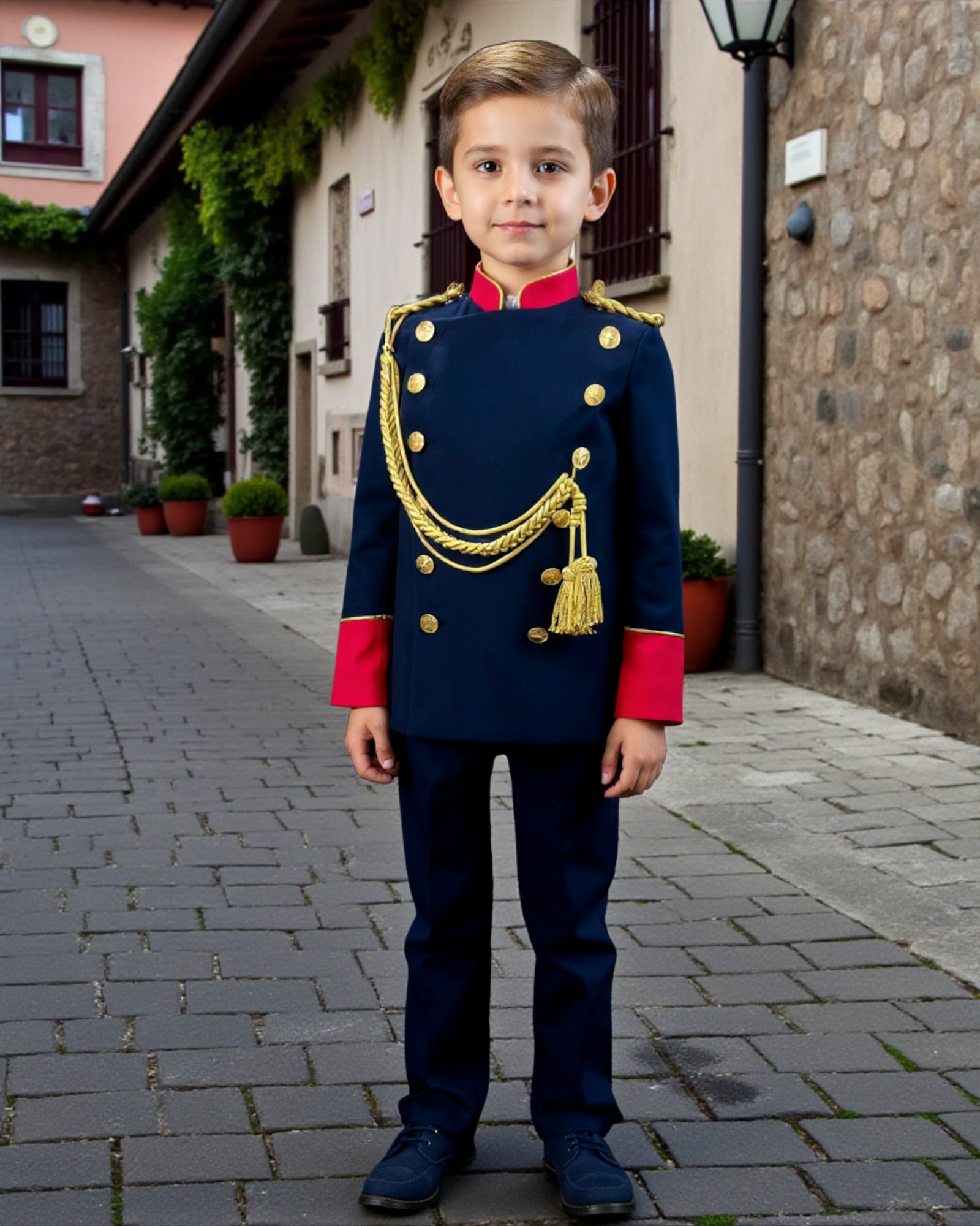 Este traje de Comunión tipo almirante, inspirado en el uniforme de gala de la Guardia Civil, destaca por su diseño detallado y simbólico. La chaqueta azul marino presenta un cuello mao y puños en rojo grana, adornados con botones dorados que llevan el emblema del cuerpo. El conjunto se completa con un pantalón a juego, camisa blanca y corbata roja, ofreciendo una estética solemne y elegante. Opcionalmente, se puede añadir un chaleco para un toque adicional de distinción.