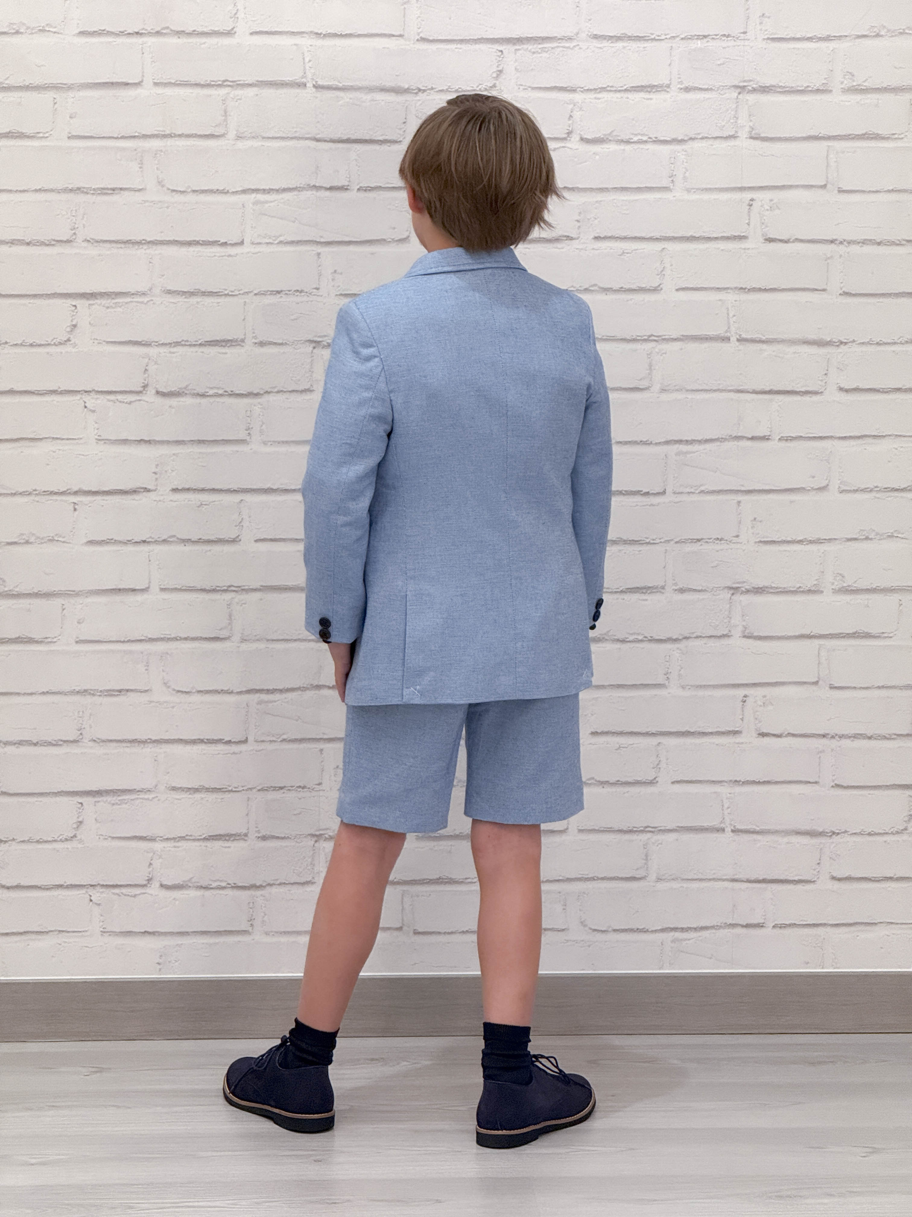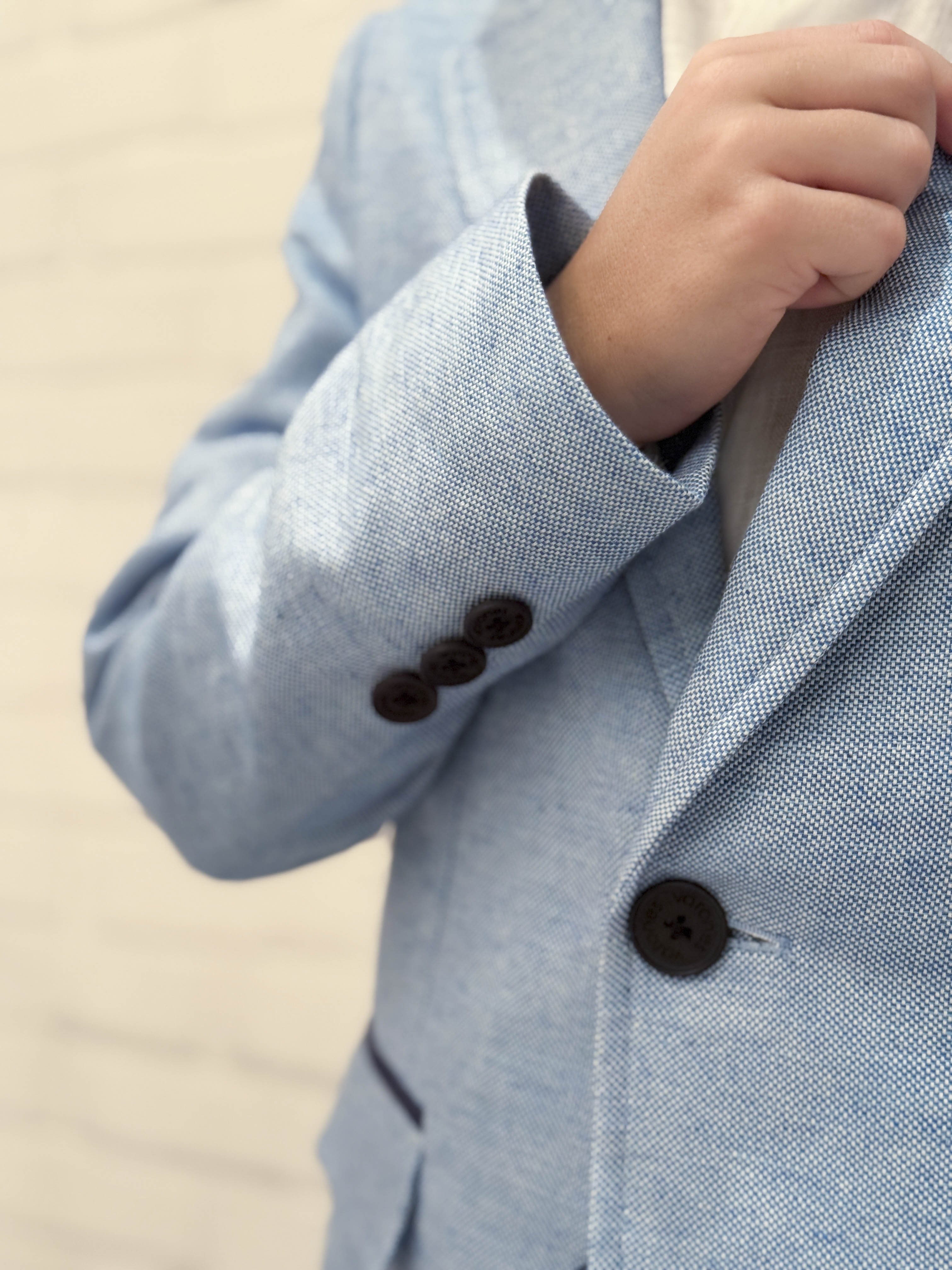Esta americana celeste para niño está pensada para los pequeños que tienen grandes momentos por vivir. Su diseño combina la ligereza de un tejido suave y texturizado con la fuerza de los detalles: ribetes azul marino que enmarcan con elegancia los bolsillos y la solapa, botones de contraste que aportan estilo propio y un corte impecable que favorece sin rigidez.