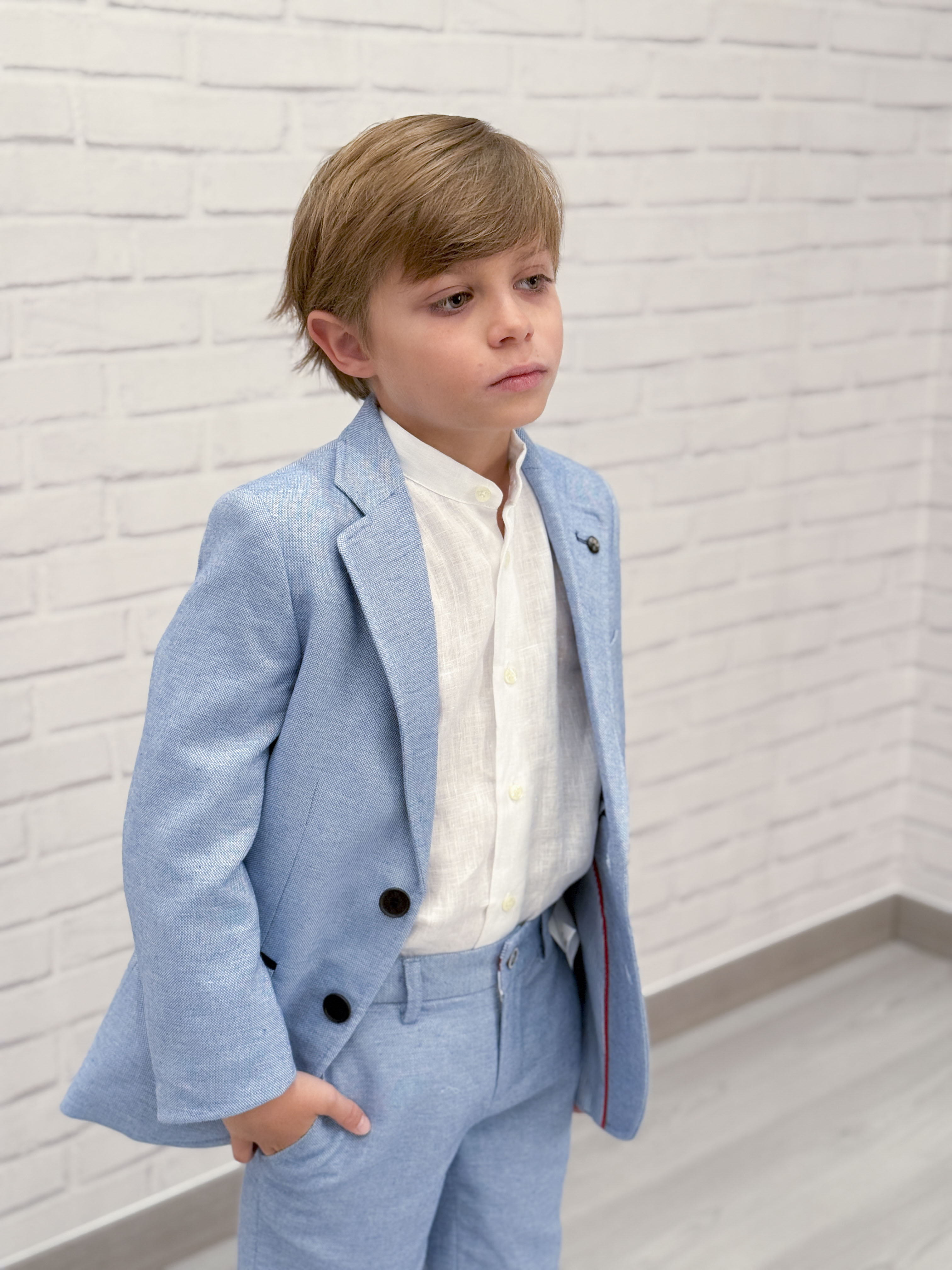 Ideal para ceremonias como Comunión, arras o bodas, esta americana elegante de niño aporta luz, frescura y distinción al conjunto. Es perfecta para combinar con pantalón marino, beige o blanco roto, corbata o pajarita, y calzado a juego en tonos celestes o clásicos. Una prenda pensada para que los niños se sientan protagonistas, cómodos y guapos, sin perder ese toque especial que los hace únicos.