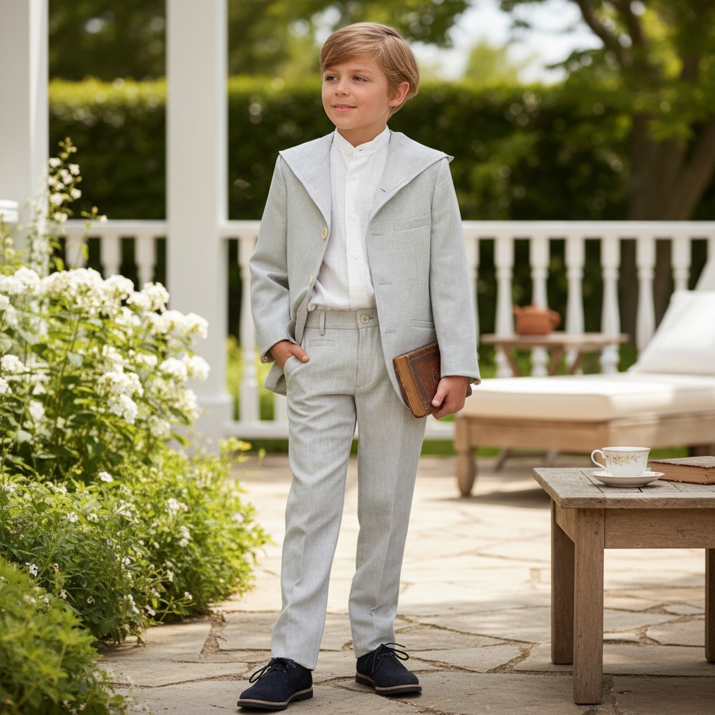 Traje de Niño en Lino Gris con Capucha – Estilo Moderno y Elegancia Natural