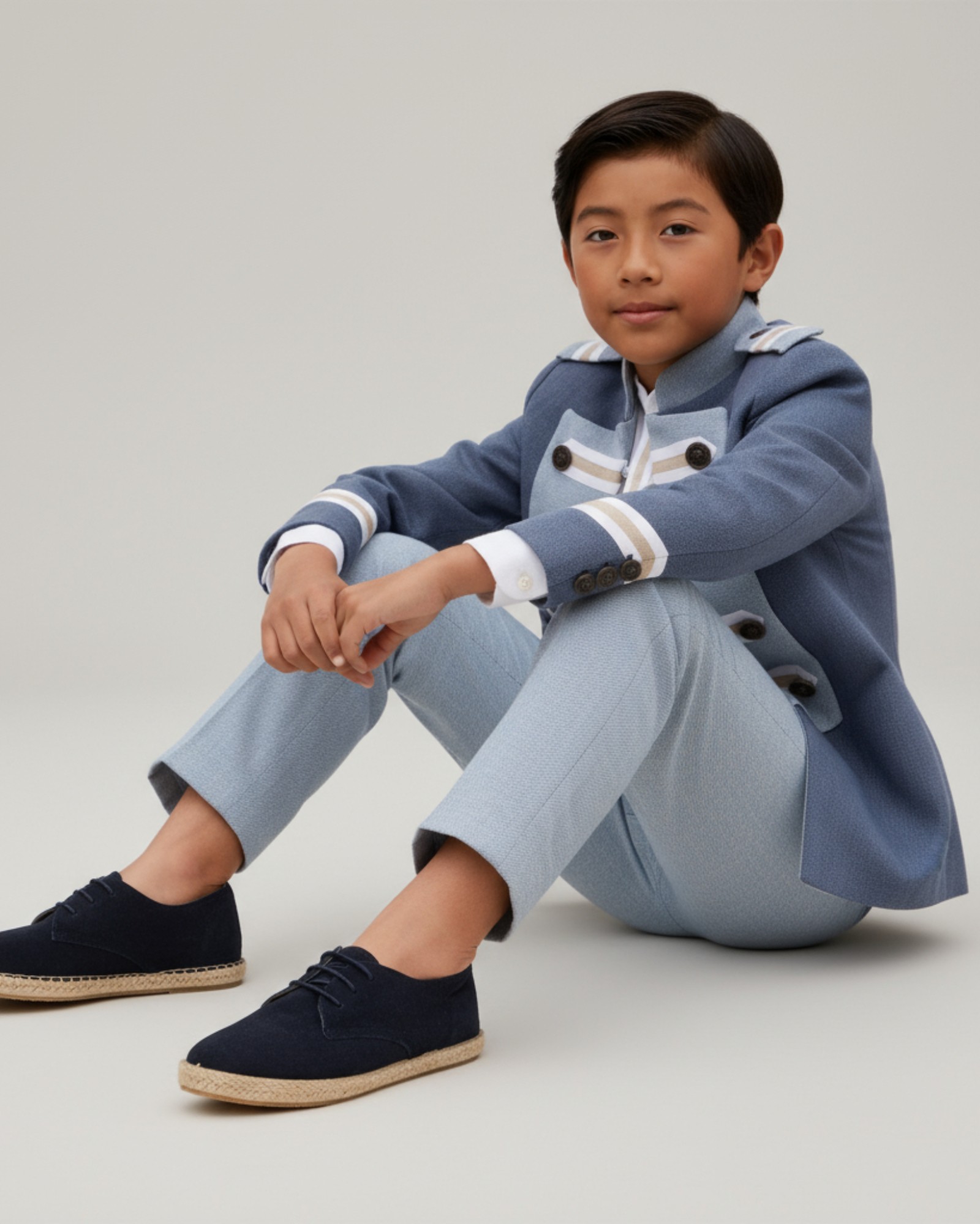 Este zapato de ceremonia para niño en serraje azul marino es la elección perfecta para completar cualquier conjunto de Comunión o traje elegante para eventos familiares. Su diseño clásico con cordones, fabricado en ante de calidad y con suela de yute natural, aporta un equilibrio ideal entre sofisticación y frescura.
