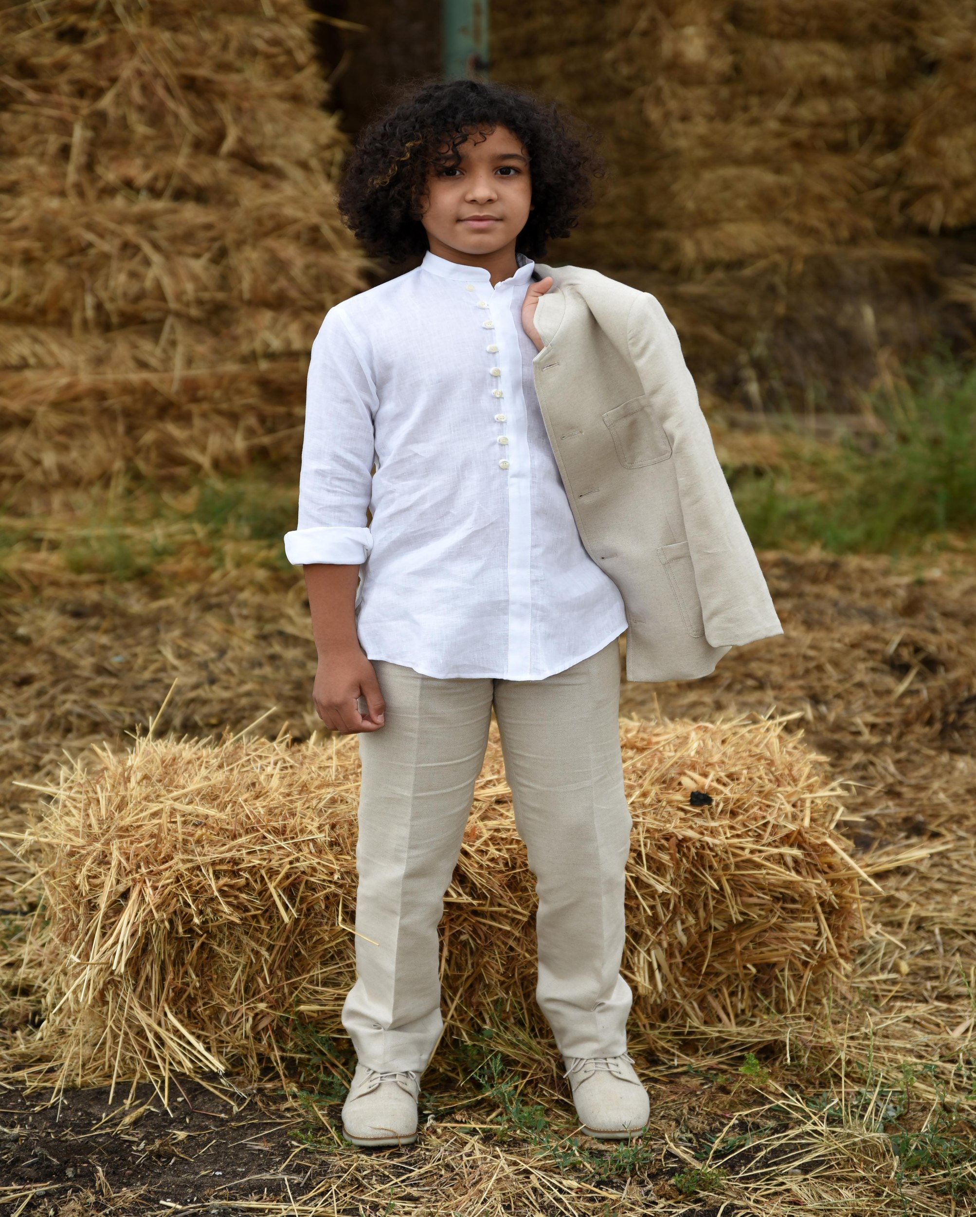 Este traje de niño, confeccionado en un precioso tono tostado claro y tejido de lino-viscosa de alta calidad, destaca por su originalidad y sobriedad. Su americana estructurada con cuello mao, bolsillos plastrón y botonadura marcada crea una silueta moderna pero respetuosa con la tradición de la moda de ceremonia infantil. El pantalón largo a juego, recto y cómodo, completa un conjunto que transmite estilo, seguridad y autenticidad.