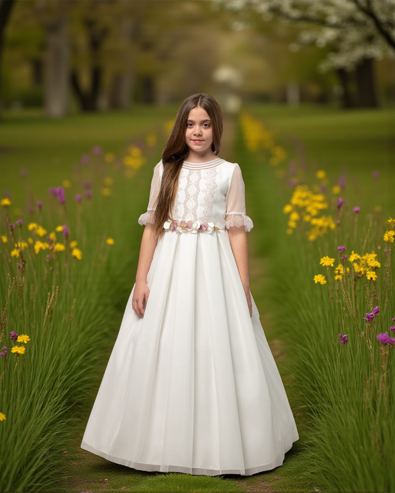 Este vestido de Comunión de niña es una joya de nuestra colección de moda de ceremonia infantil. Diseñado para niñas que vivirán uno de los momentos más importantes de su infancia, este modelo combina tradición, elegancia artesanal y detalles que emocionan desde el primer instante.