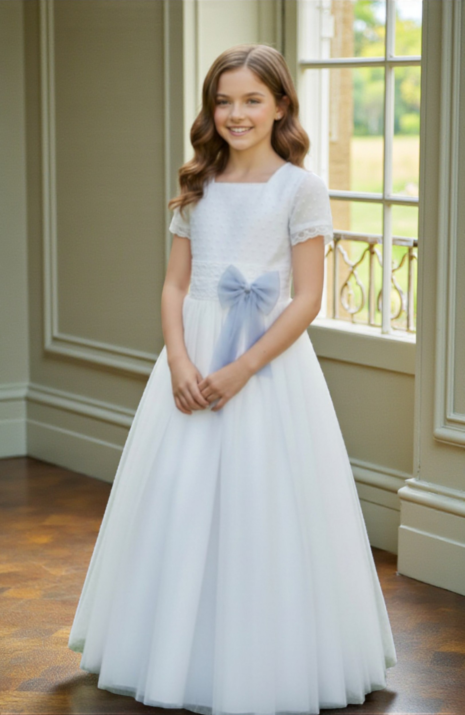 El fajín de tul en azul empolvado, colocado en diagonal sobre el delantero y terminado en gran lazo trasero, aporta contraste y personalidad al conjunto. La espalda en pico con botones forrados y detalles de encaje termina de definir este look de Comunión con elegancia atemporal.